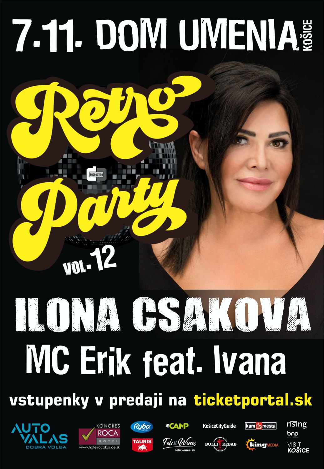 Pozor, pozor! Uvádzame ďalšie pokračovanie najlepšej košickej RETRO PÁRTY so 14-ročnou tradíciou. Tentoraz vás v historických priestoroch Domu Umenia zabavia Československé top hviezdy 80-tych a 90-tych rokov česká pop diva ILONA CSAKOVA a slovenská hudobná dvojica MC ERIK feat. IVANA ! Skvelú zábavu zabezpečia aj djské legendy - Julo Hrabušický, 80s & 90s MUSIC FACTORY, tanečné skupiny a ďalší hostia. Baviť sa budete môcť aj na oldies video-diskotéke s DJ legendou Petrom Husákom. Nebude chýbať ani tradičná polnočná tombola o hodnotné ceny. Dvere Domu Umenia otvárame v piatok 7. novembra o 19:45. Začiatok podujatia je o 20:15. Podujatie moderuje pán Richard Herrgott. V cene vstupenky na sedenie je aj malé občerstvenie. V cene vstupenky TOP sedenie je navyše Hubert a čerstvé ovocie.